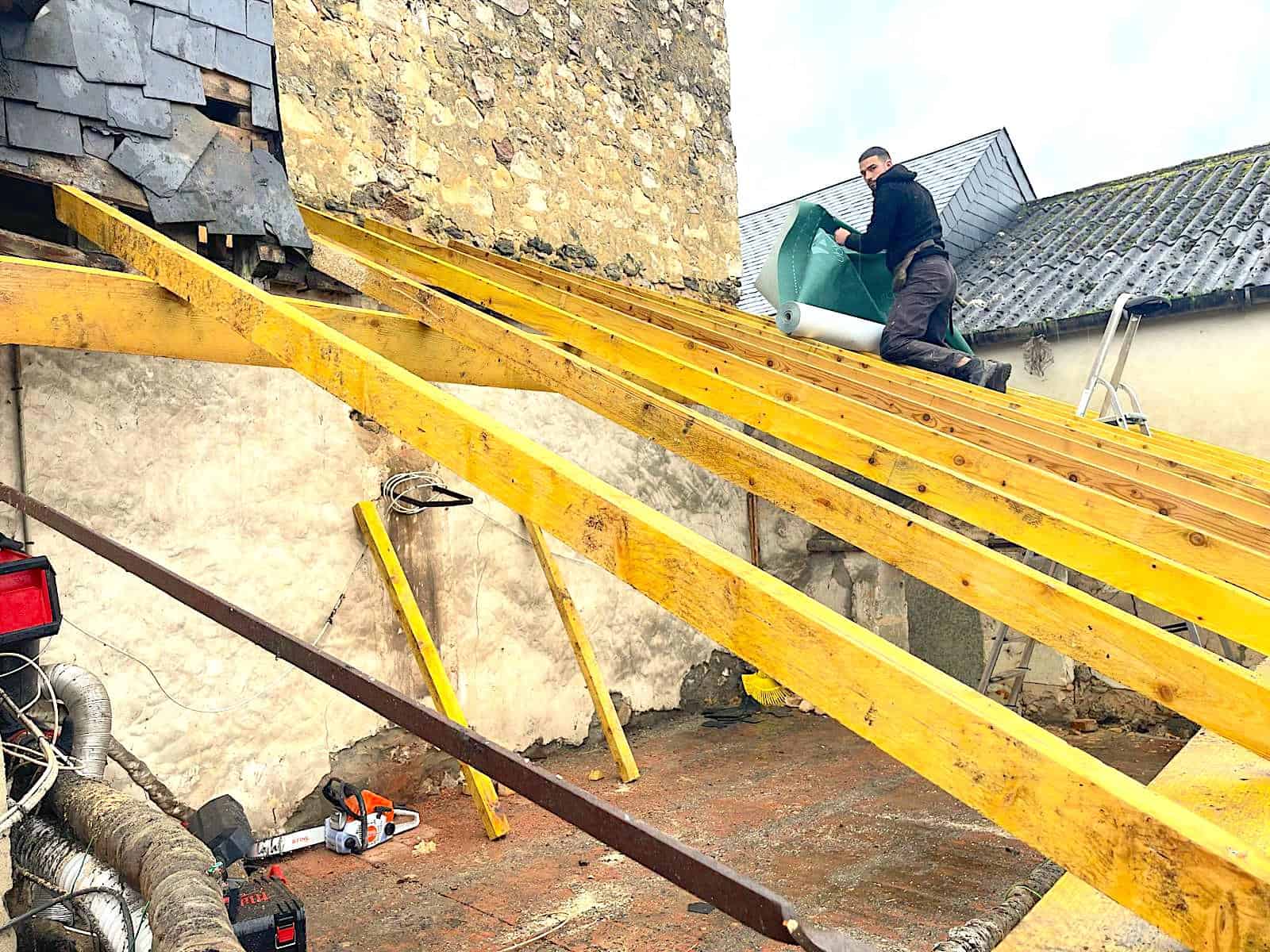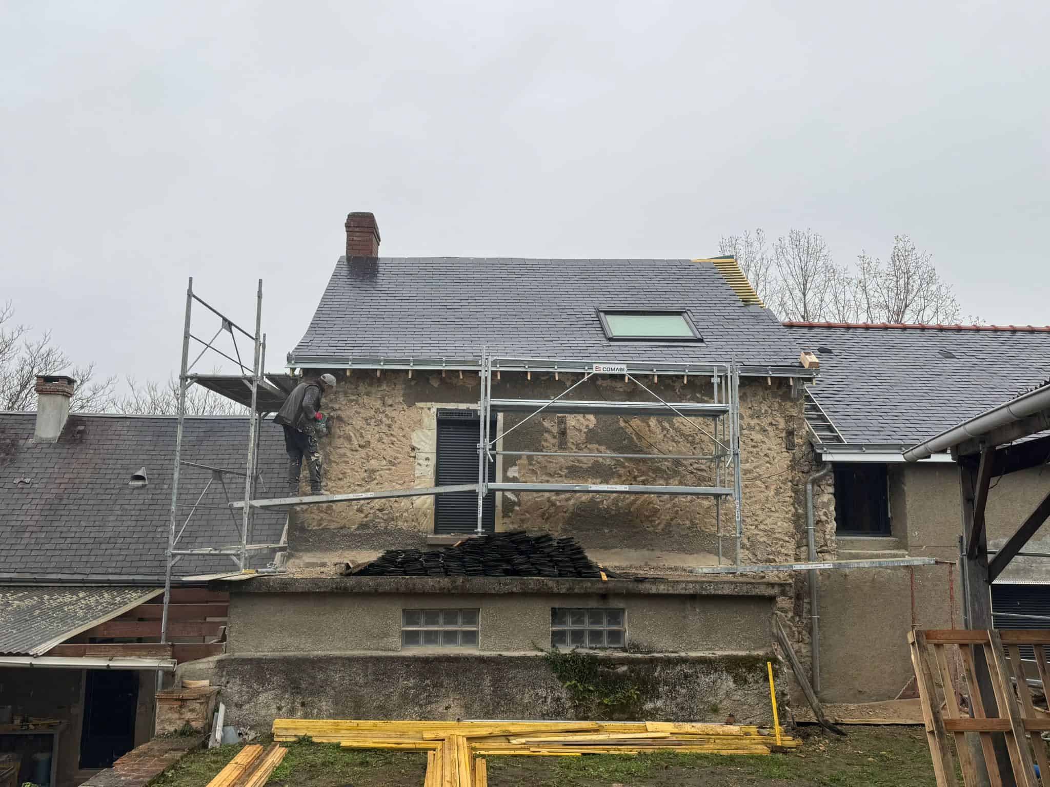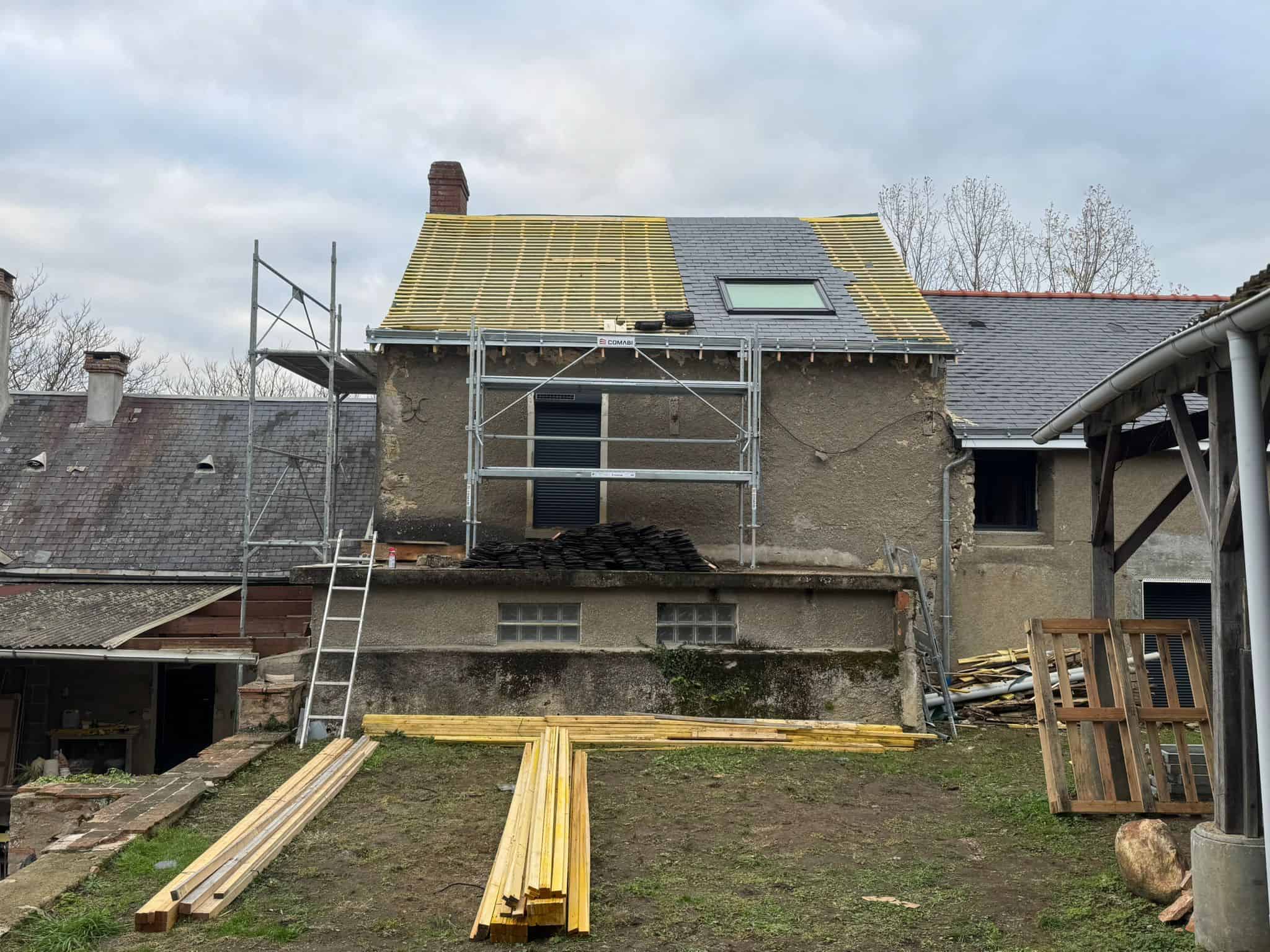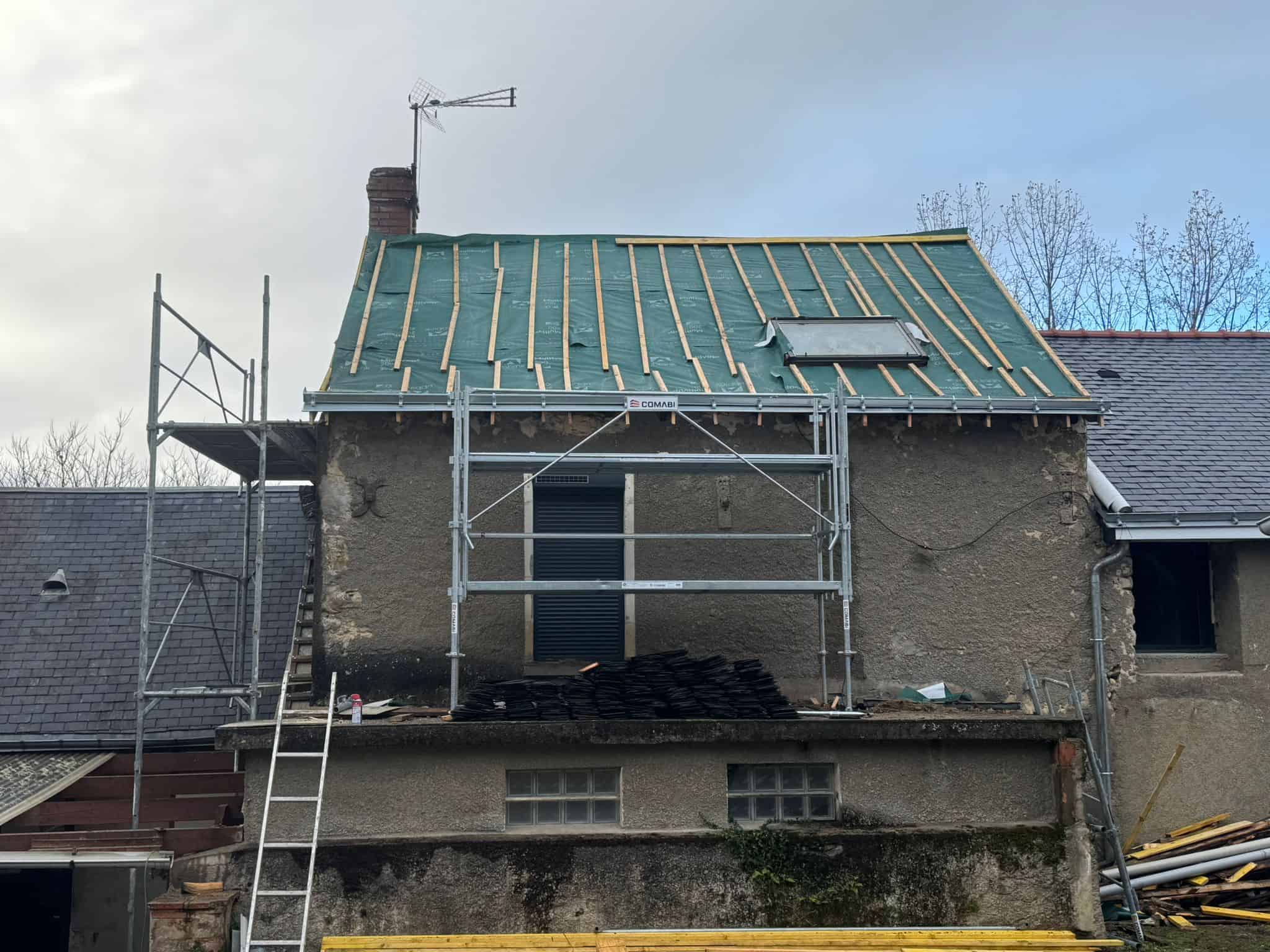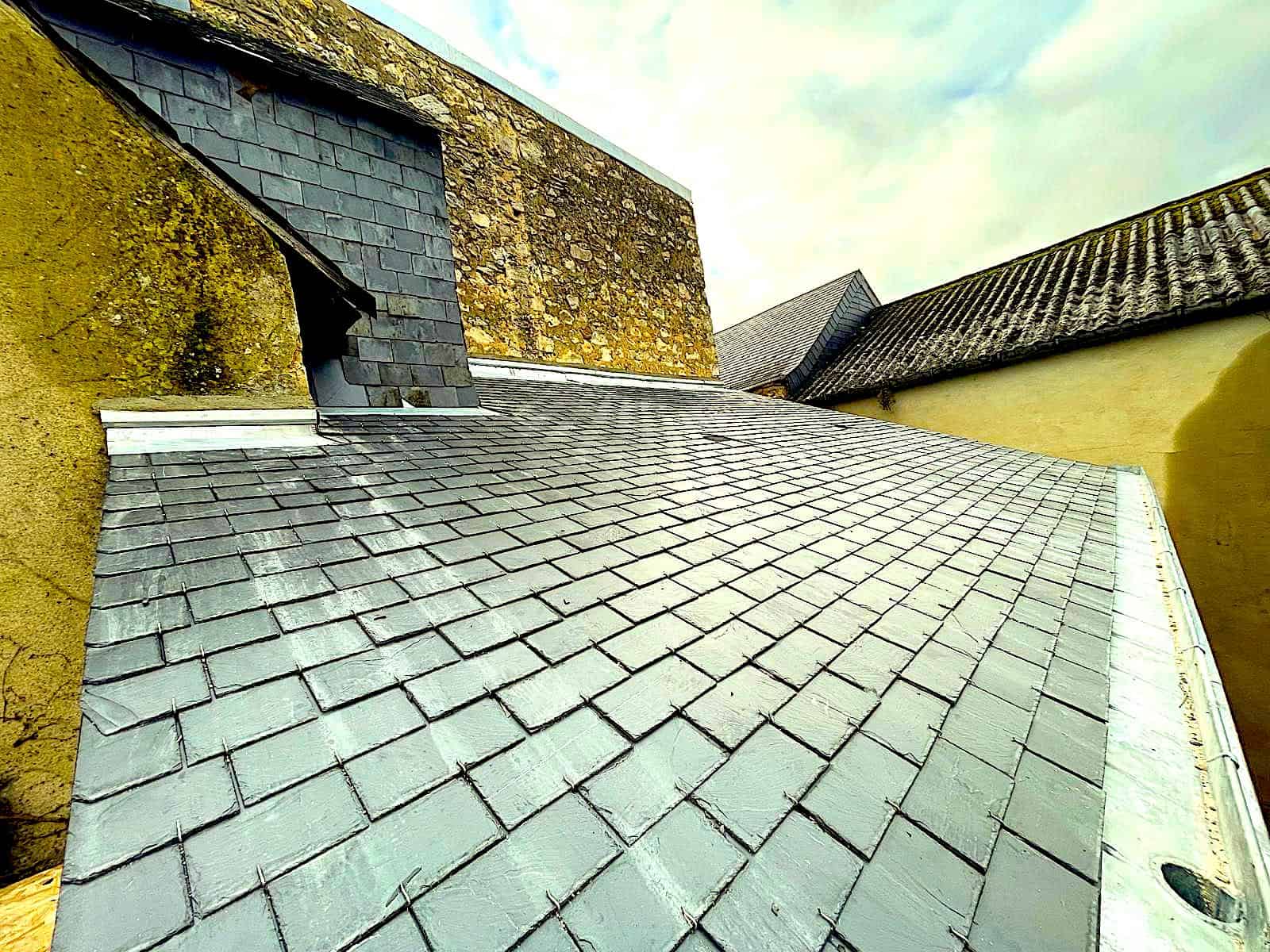 Dépose de l’ancienne toiture, vérification de la charpente, réparation si nécessaire, mise en place du support d’étanchéité puis pose soignée des ardoises ou tuiles.