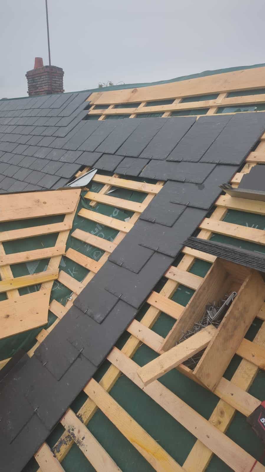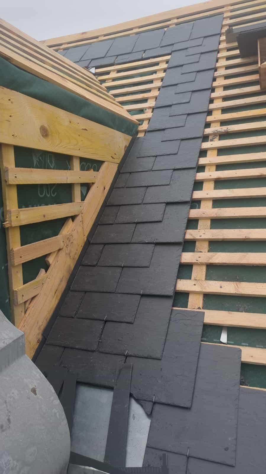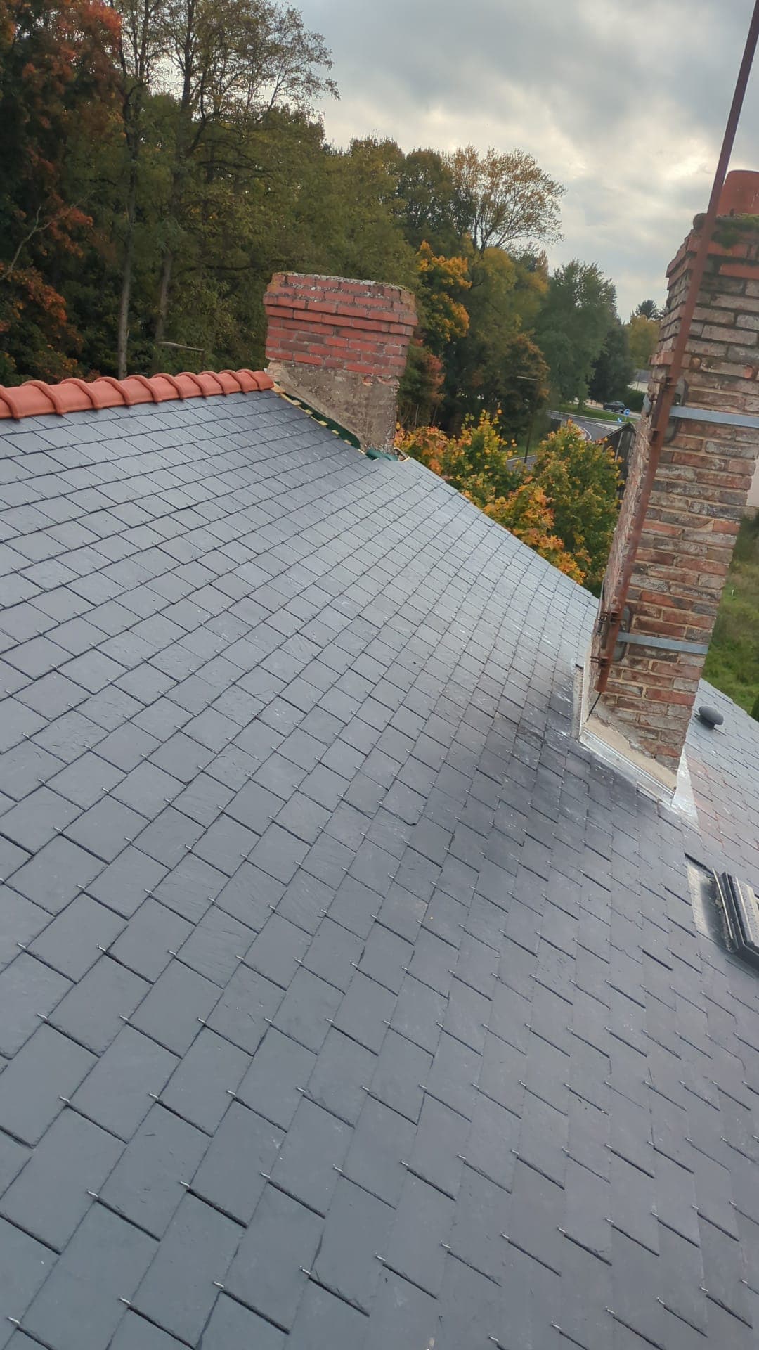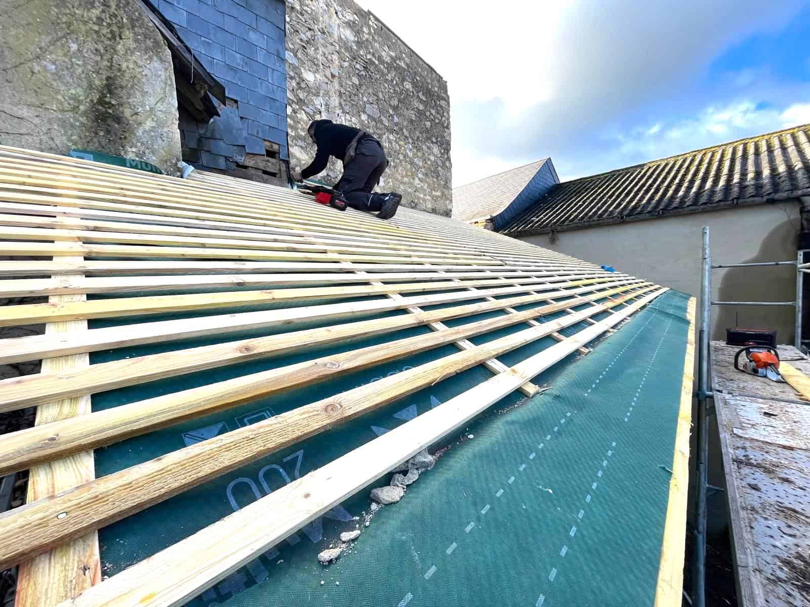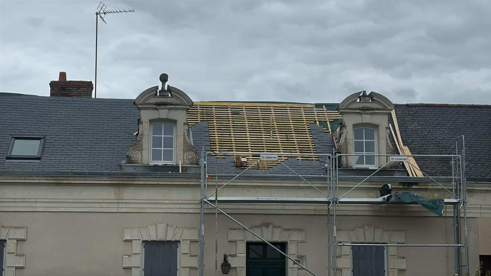 Dépose de l’ancienne toiture, vérification de la charpente, réparation si nécessaire, mise en place du support d’étanchéité puis pose soignée des ardoises ou tuiles.